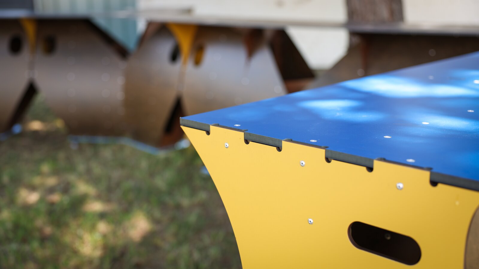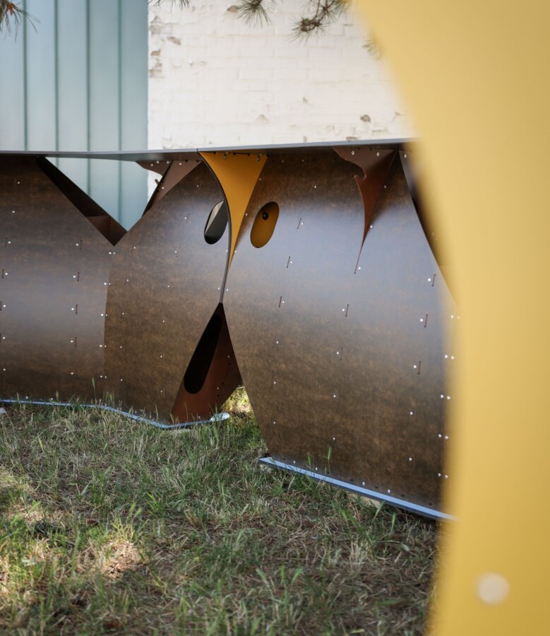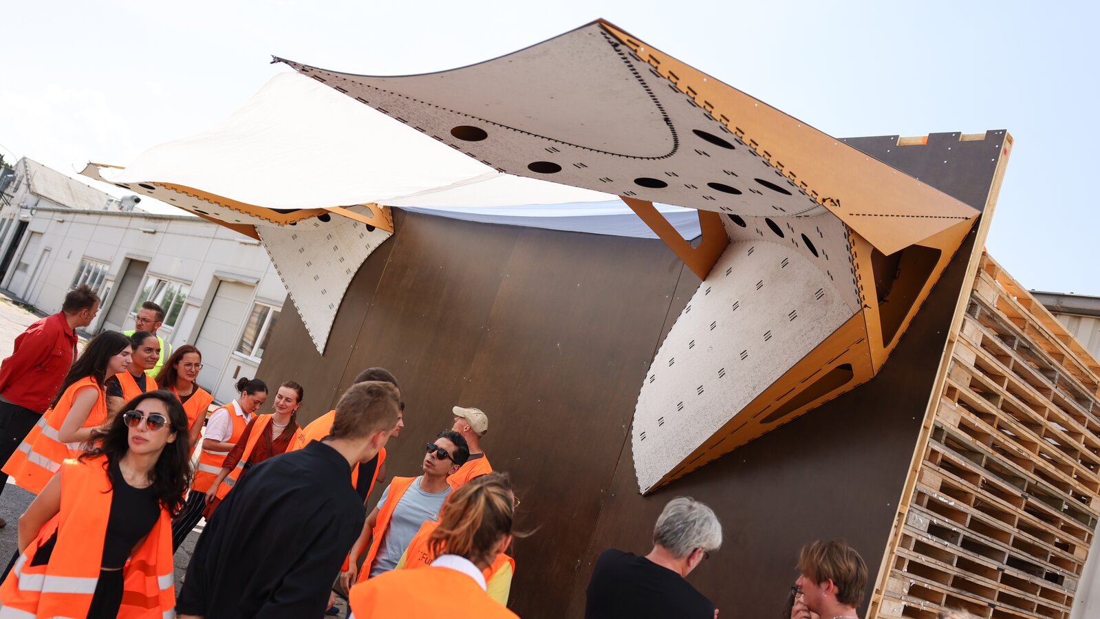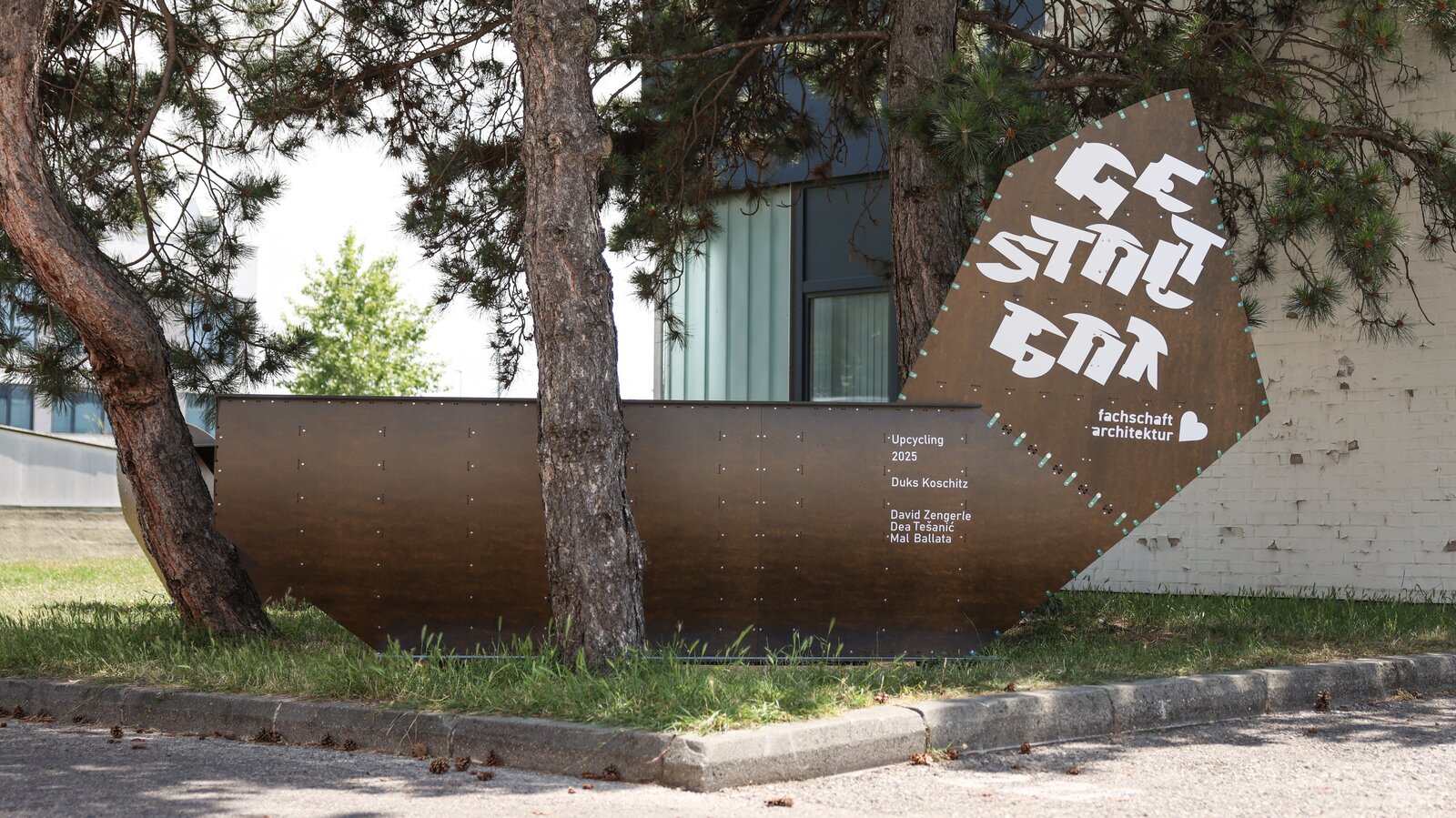 - UmGedacht: Two canopies designed as innovative surface structures made of 3 mm thick pressed panels and a textile membrane.