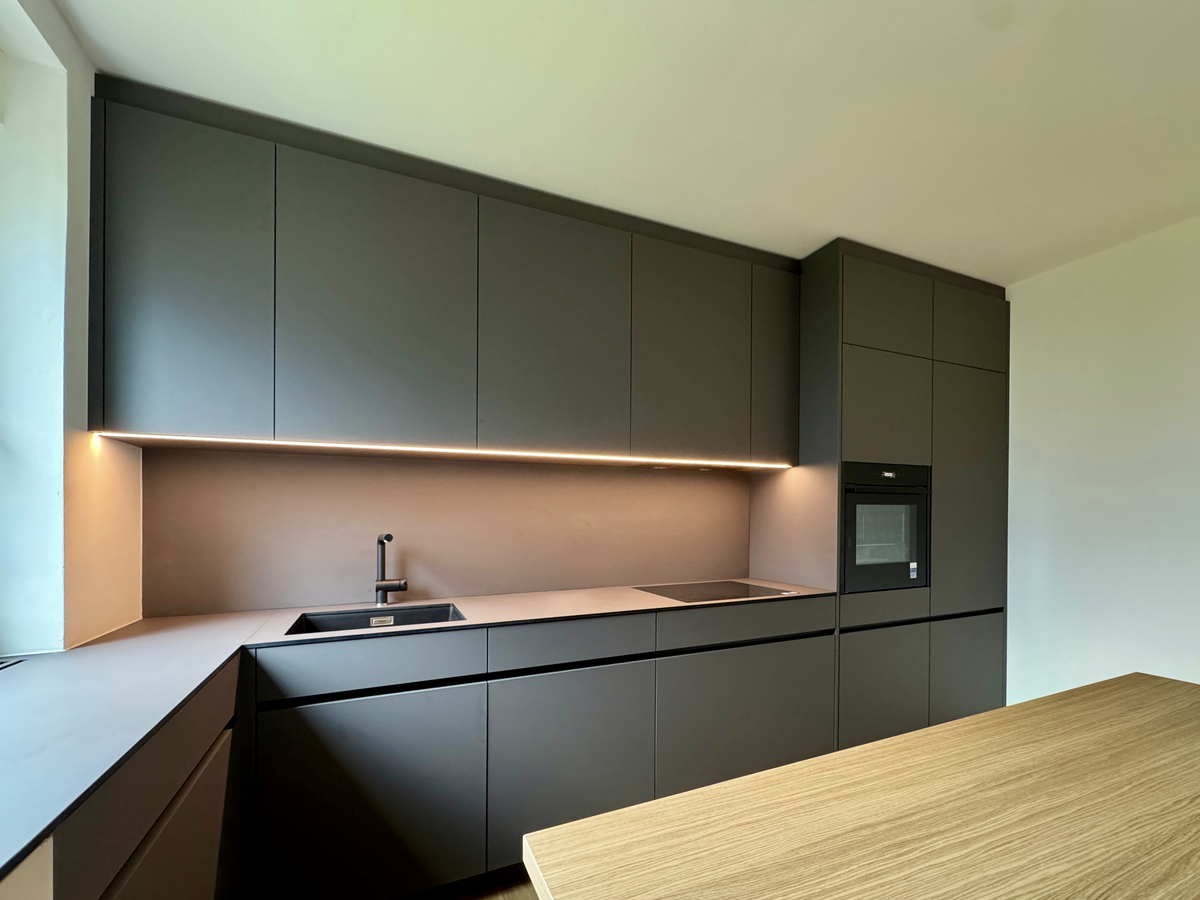 The worktop is made of Compact Interior in decor 0077 with an AP surface finish.