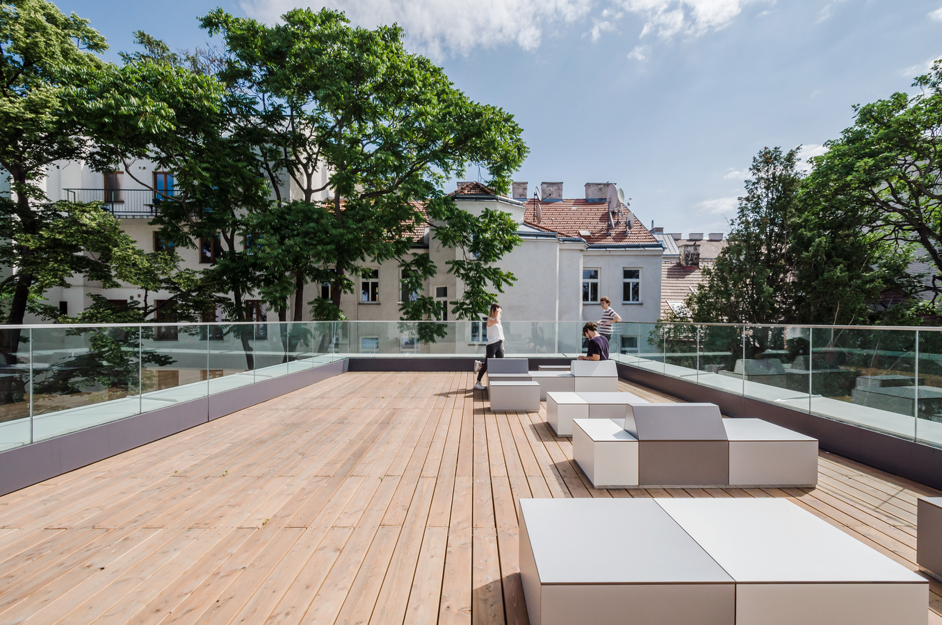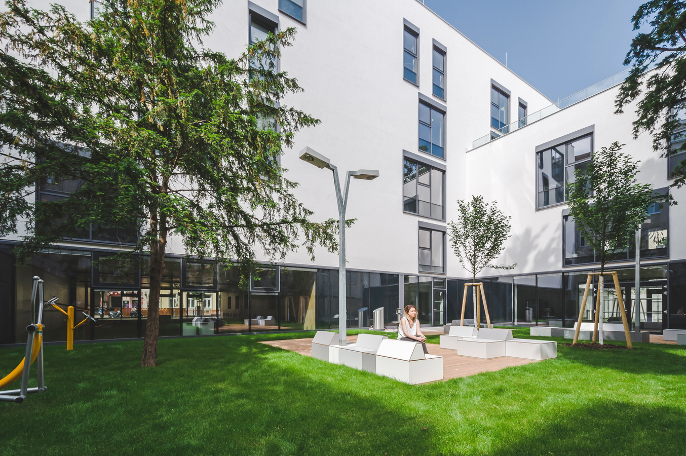 In addition to the green courtyard, students can use a sunny courtyard terrace on the second floor. Open spaces are available to students at any time within a few steps.