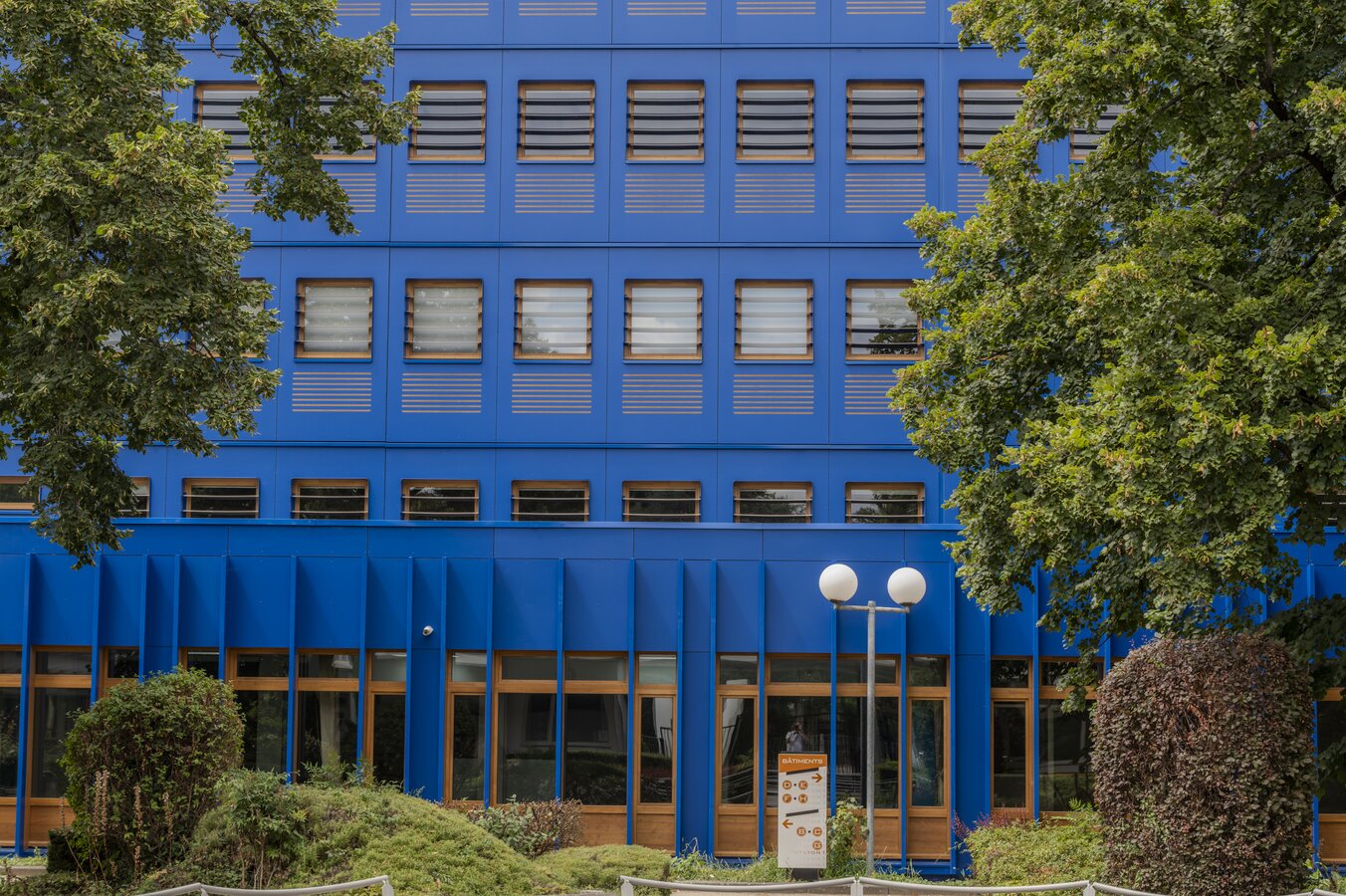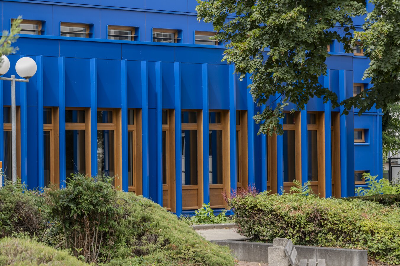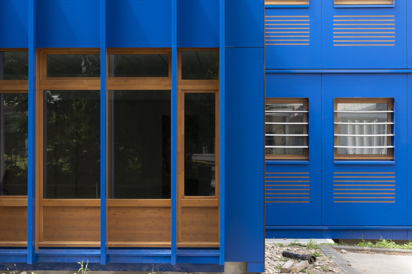 Si la grande proportion de composants biosourcés dans les panneaux Fundermax, associée à leurs larges dimensions, ont été des critères déterminants dans ce projet, l’Agence Supermixx a également été séduite par leurs atouts esthétiques. La large gamme de finitions disponibles, composée de 132 décors et de différentes nuances, encourageait à la créativité et l’originalité. L’architecte a trouvé la teinte idéale dans la gamme des bleus et opté pour Gentiane blue NT. Une proposition engagée, soutenue par la maîtrise d’ouvrage. Dans une démarche de durabilité, la contre face des panneaux a été teinte en blanche pour faciliter la transformation des chutes issues de l’usinage en étagères solaires.