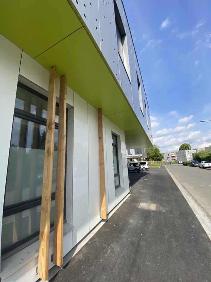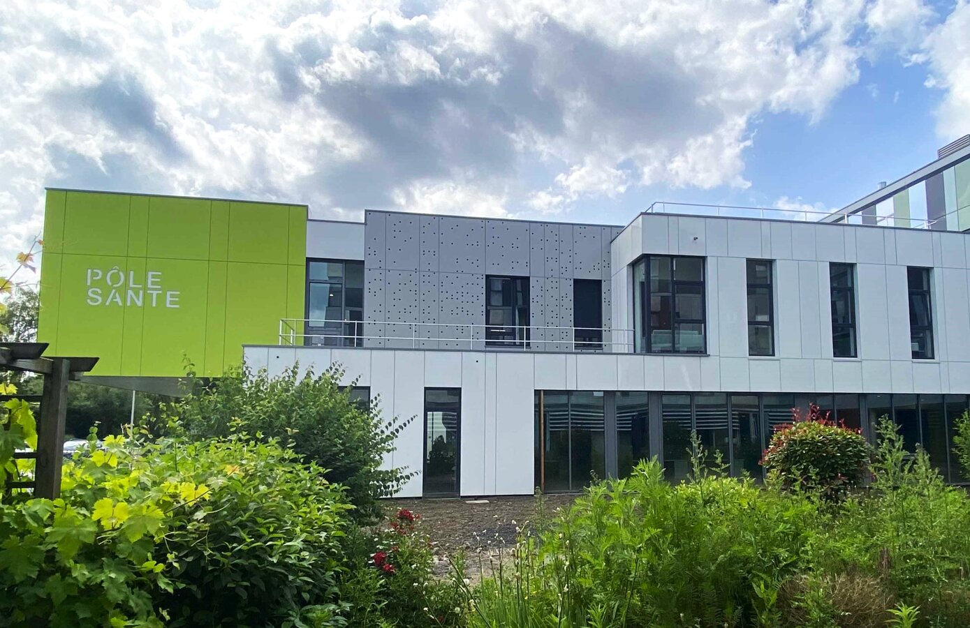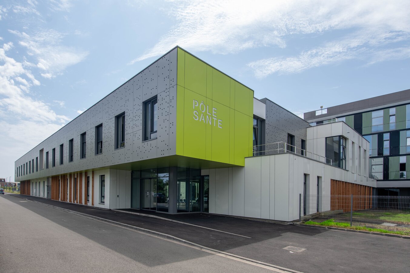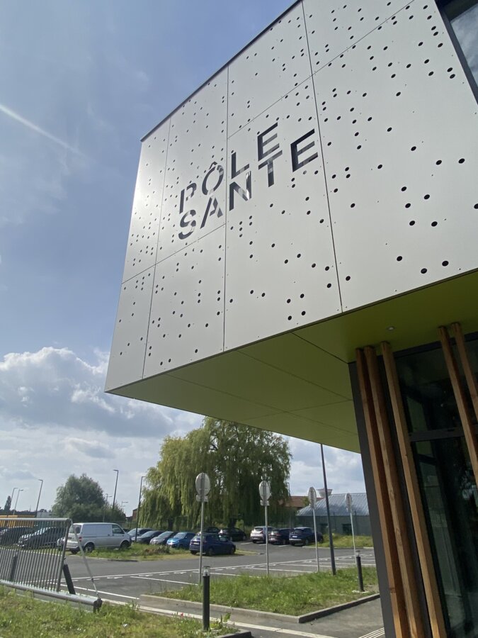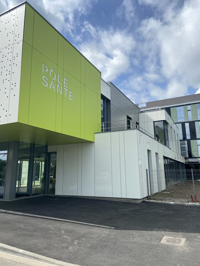 Il nostro obiettivo era creare una coerenza visiva tra le diverse aree dell'edificio. Le superfici sottostanti di colore verde giallastro costituiscono una transizione senza soluzione di continuità tra il parcheggio e l'area della reception. Questo legame visivo è rafforzato dalla scritta “Pôle Santé” in bianco sullo sfondo verde della decorazione Max Exterior, resa possibile dalle soluzioni individuali di Fundermax.