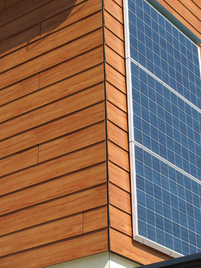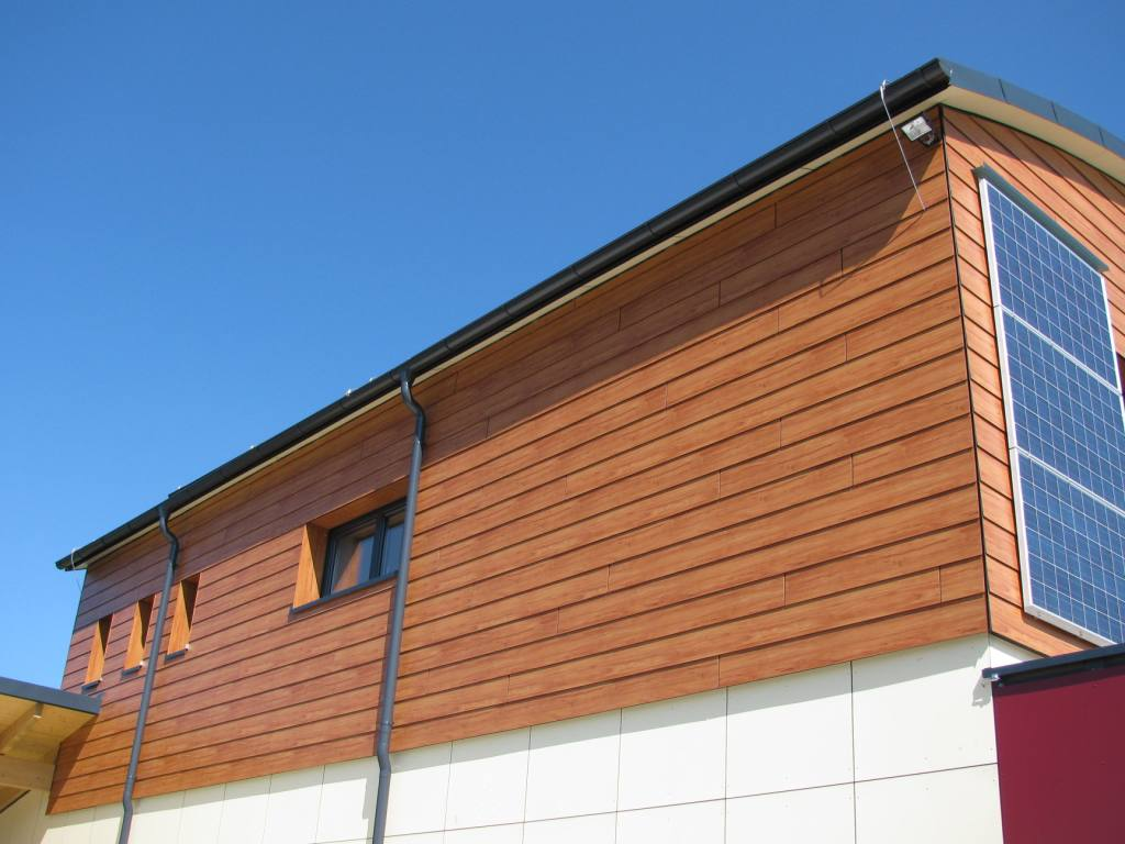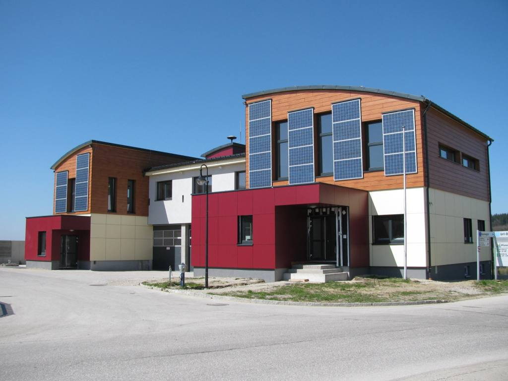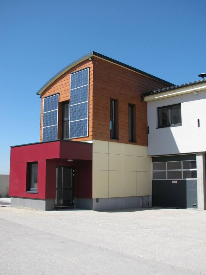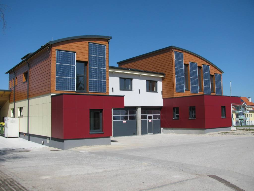 Fundermax Fassade Feuerwehr aus Max Compact Exterior in den Dekoren 0272, 0691 und 0065 sowie in der Oberfläche NT