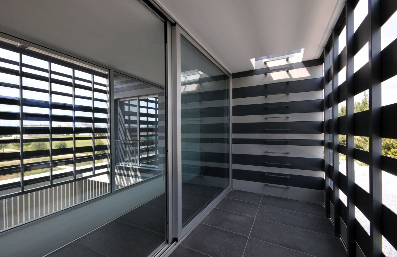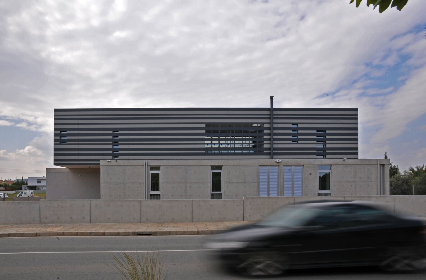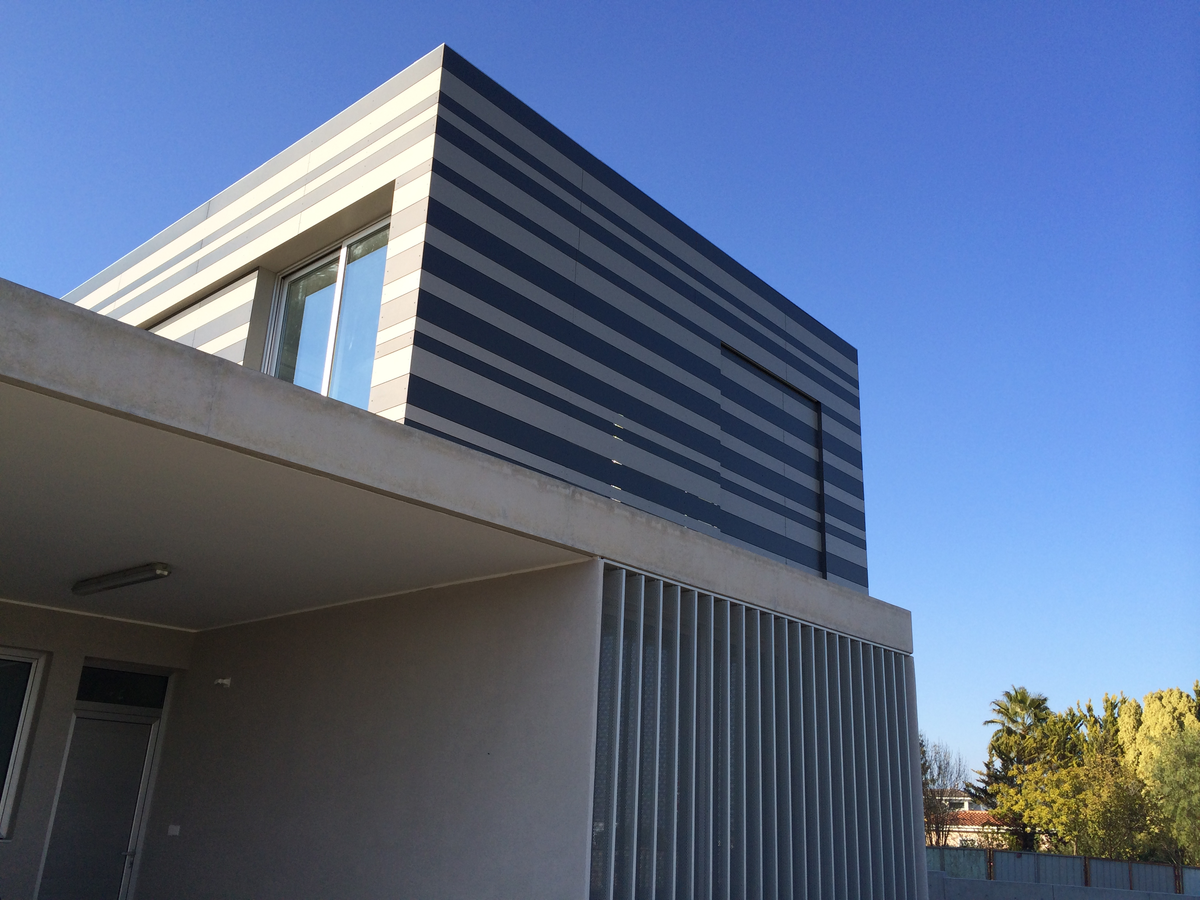 Fundermax Fassade und Sonnenschutz Haus in Strovolos aus Max Compact Exterior in den Dekoren 0070 und 0747 sowie der Oberfläche NT