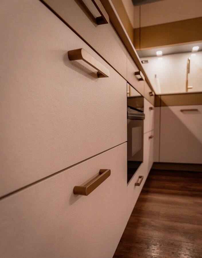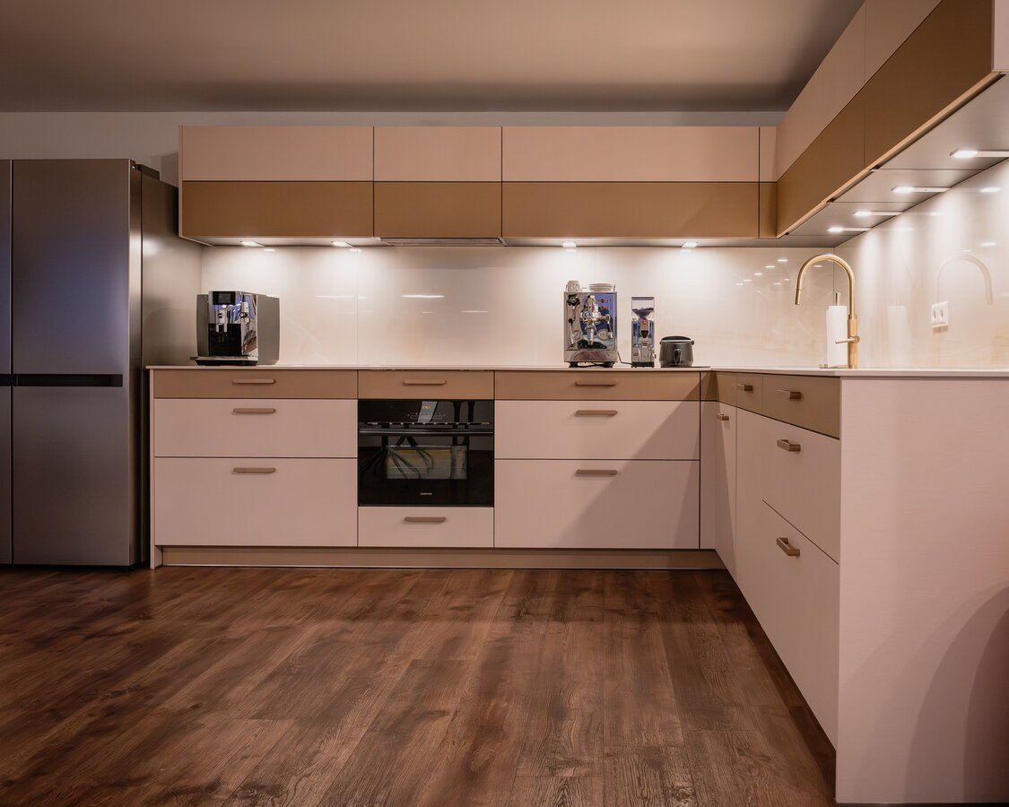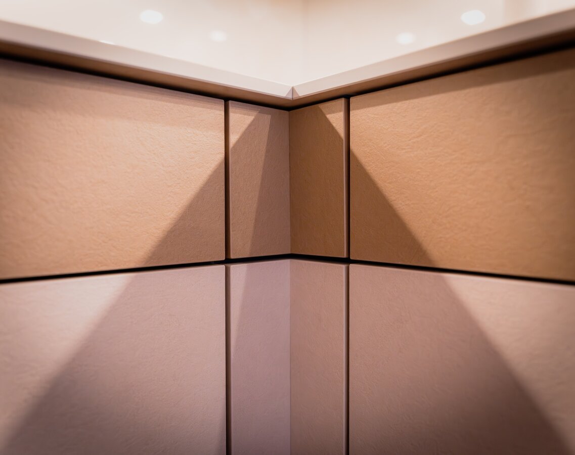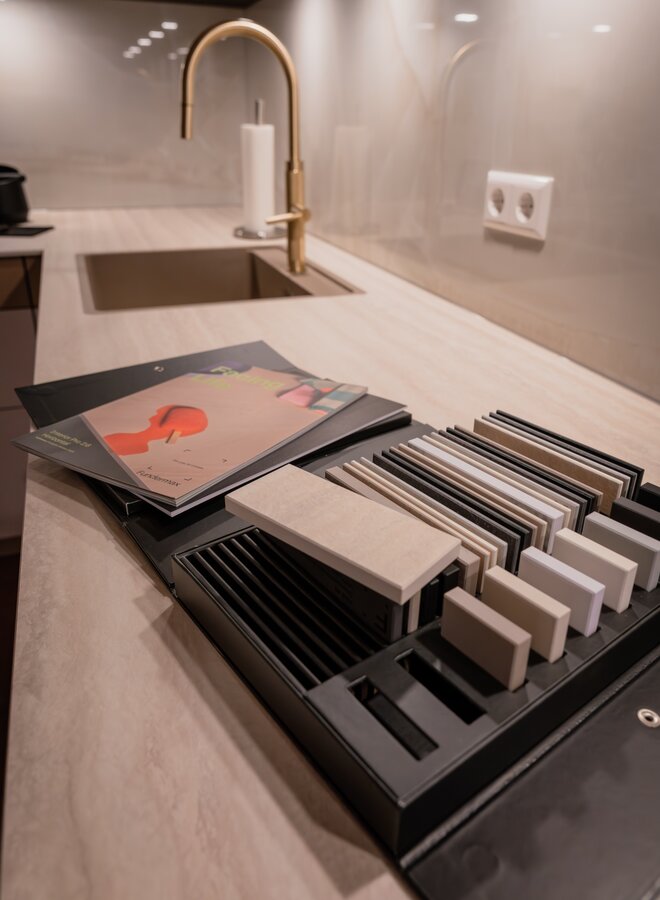 Voor de fronten van deze keuken zijn Star Favorit platen gebruikt in de decors 3465 Gypsum Ivory en 3467 Gypsum Safari met het RI oppervlak. Het werkblad bestaat uit een Max Compact Interior plaat in het decor 0989 Cream Vivanto Travertine, met een Tortora kern en de oppervlaktestructuur SX Saxum.