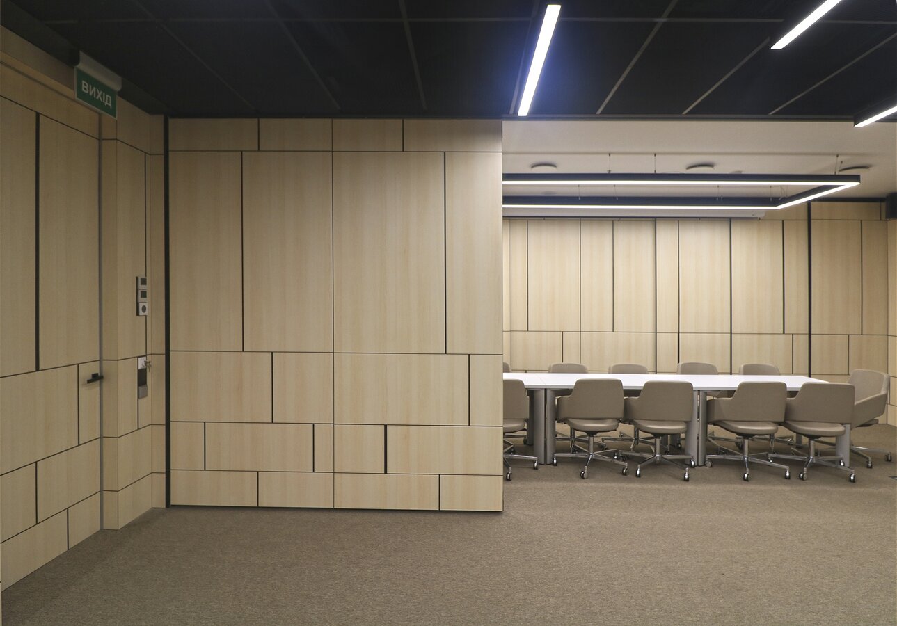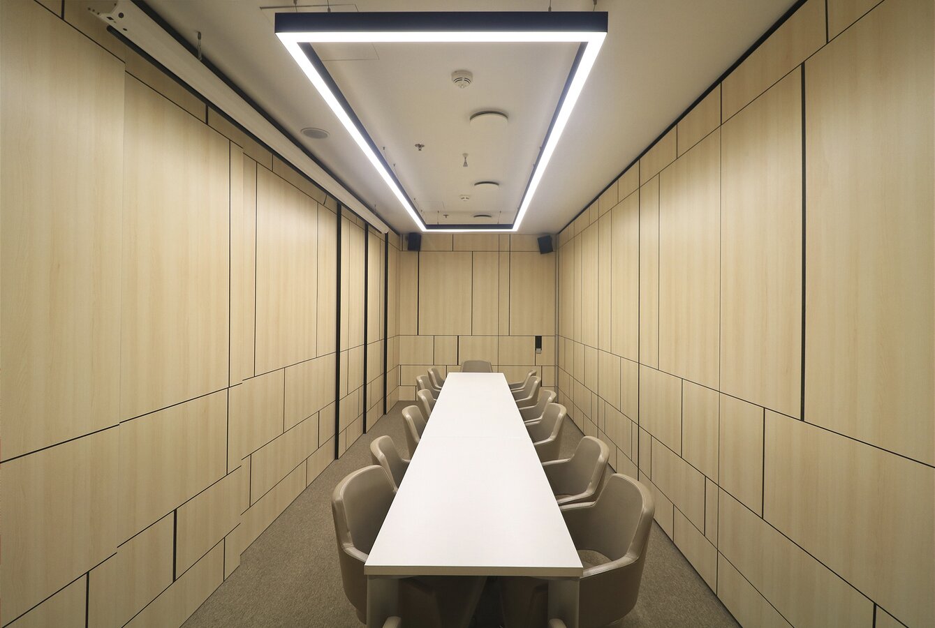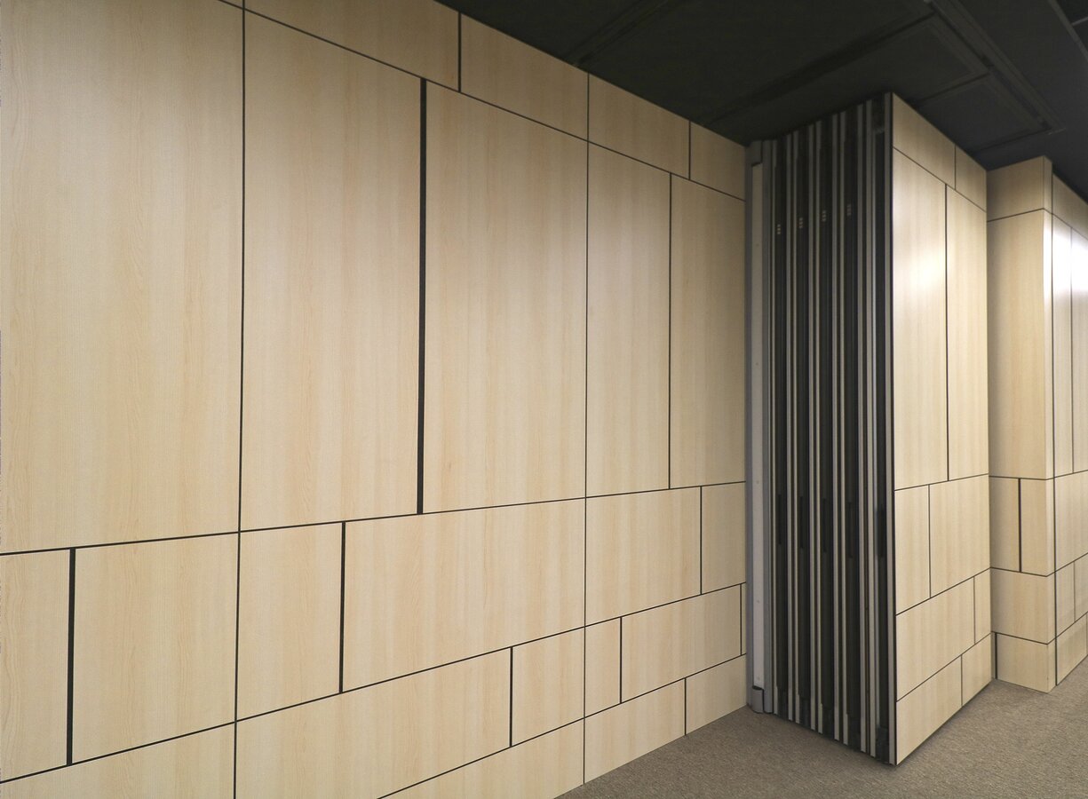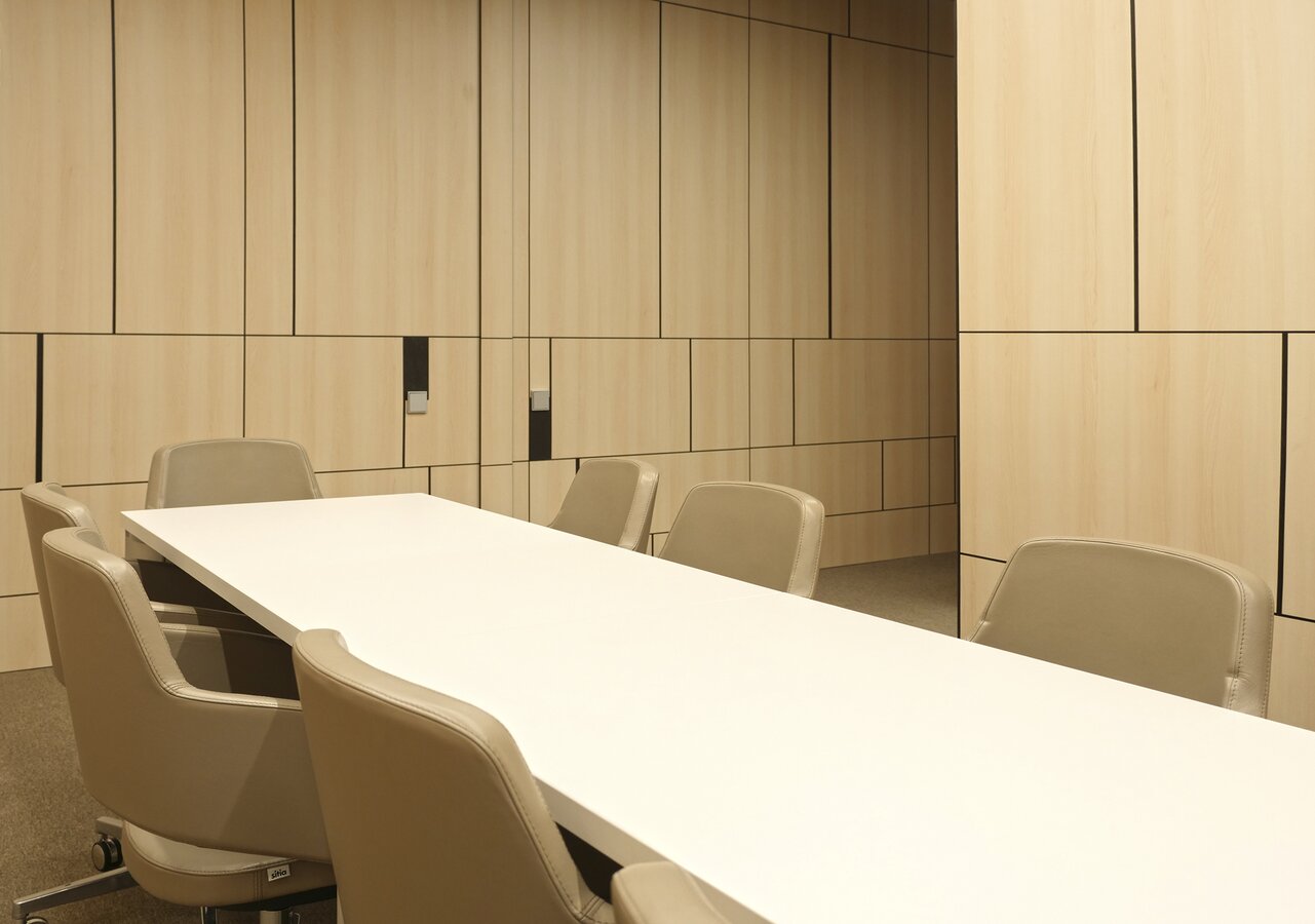 Fundermax Wandverkleidung Seminarraum AEQUO aus Max Compact Interior im Dekor 0102 sowie der Oberfläche FH