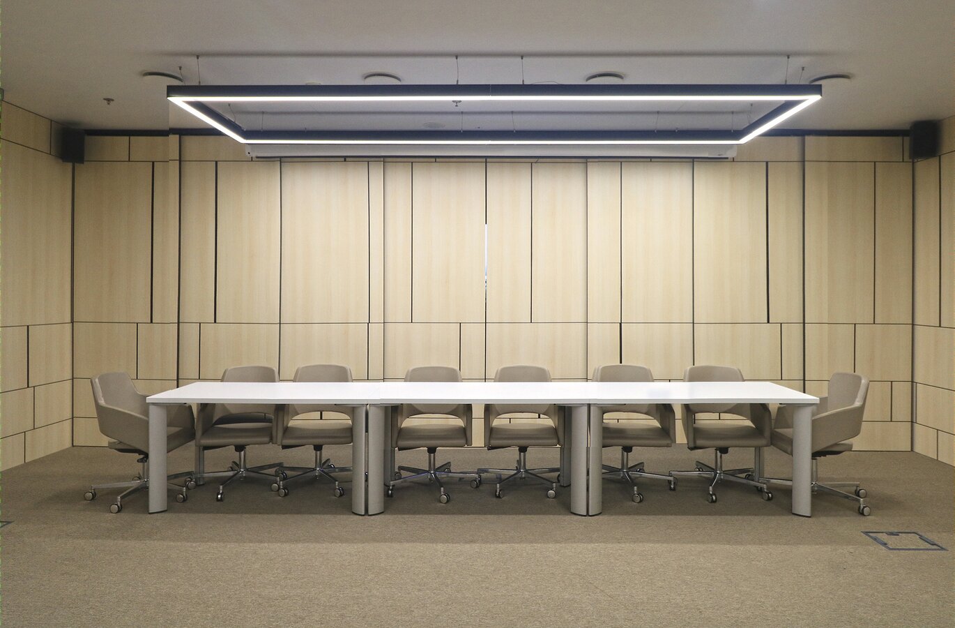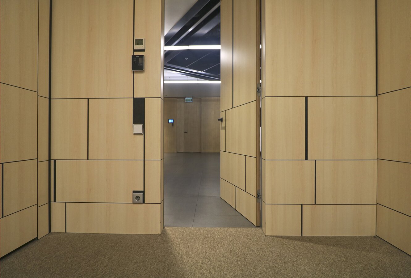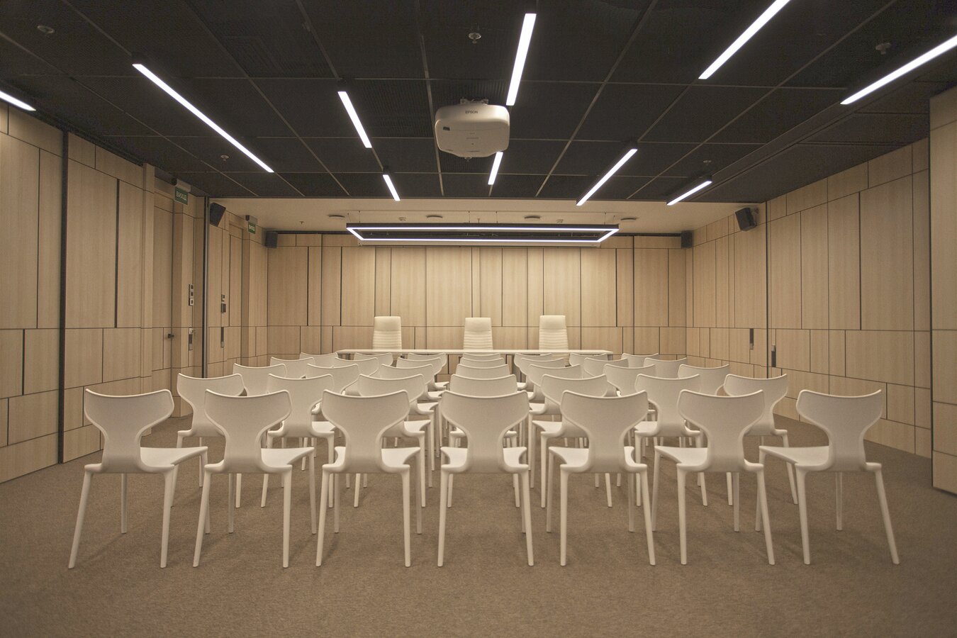 Fundermax Wandverkleidung Seminarraum AEQUO aus Max Compact Interior im Dekor 0102 sowie der Oberfläche FH