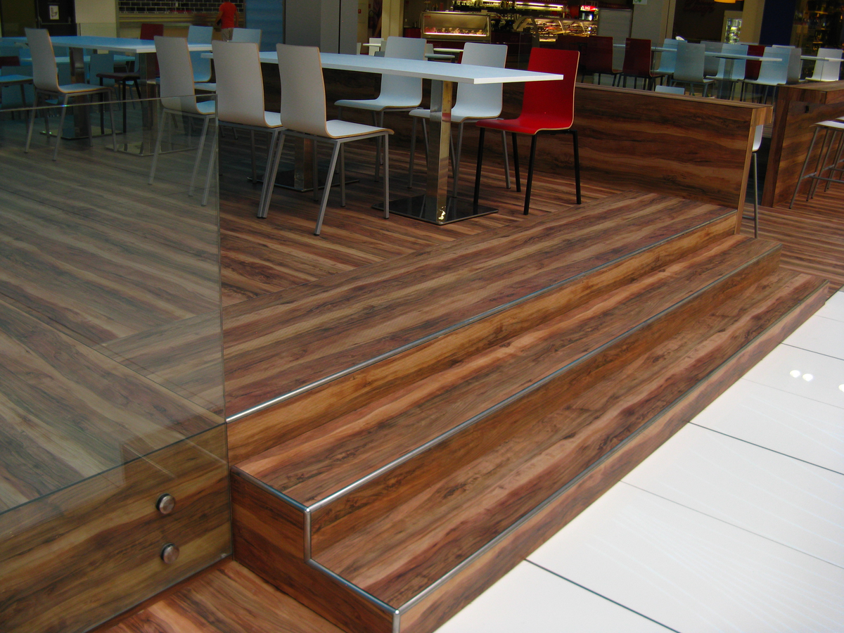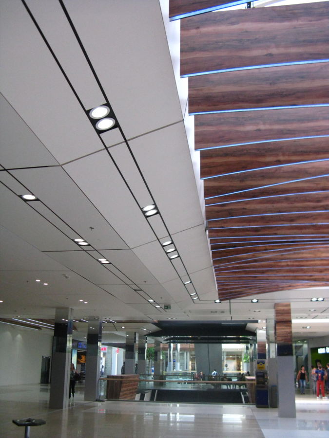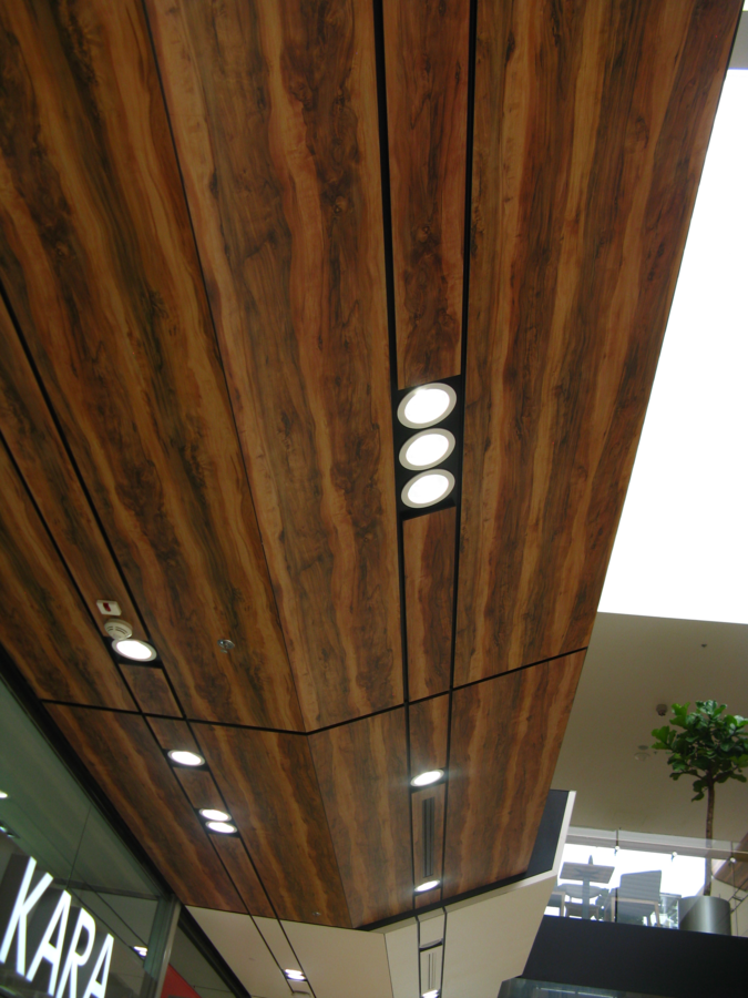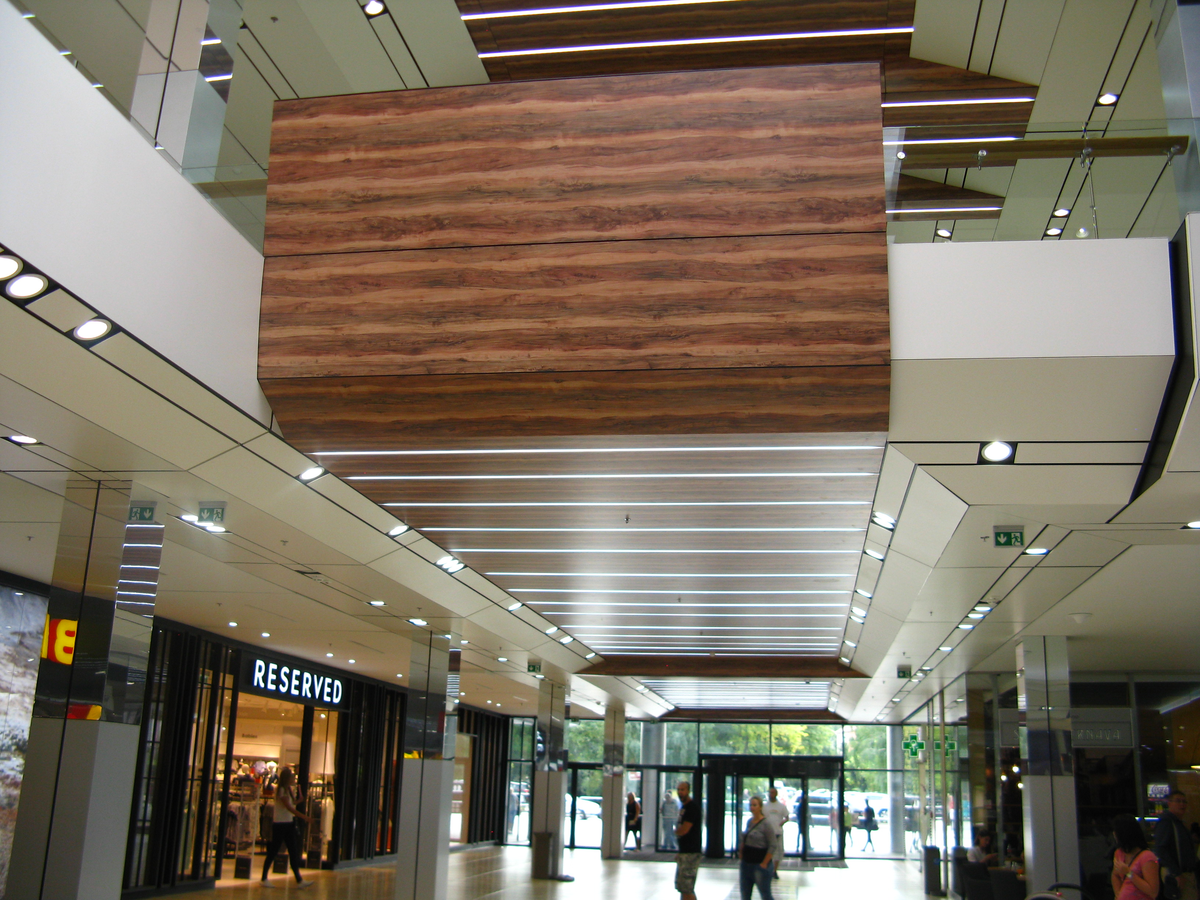 Fundermax Wandverkleidung Einkaufszentrum City Arena aus Max Compact Interior in den Dekoren 2715, 0085 und 0080 sowie in der Oberfläche FH