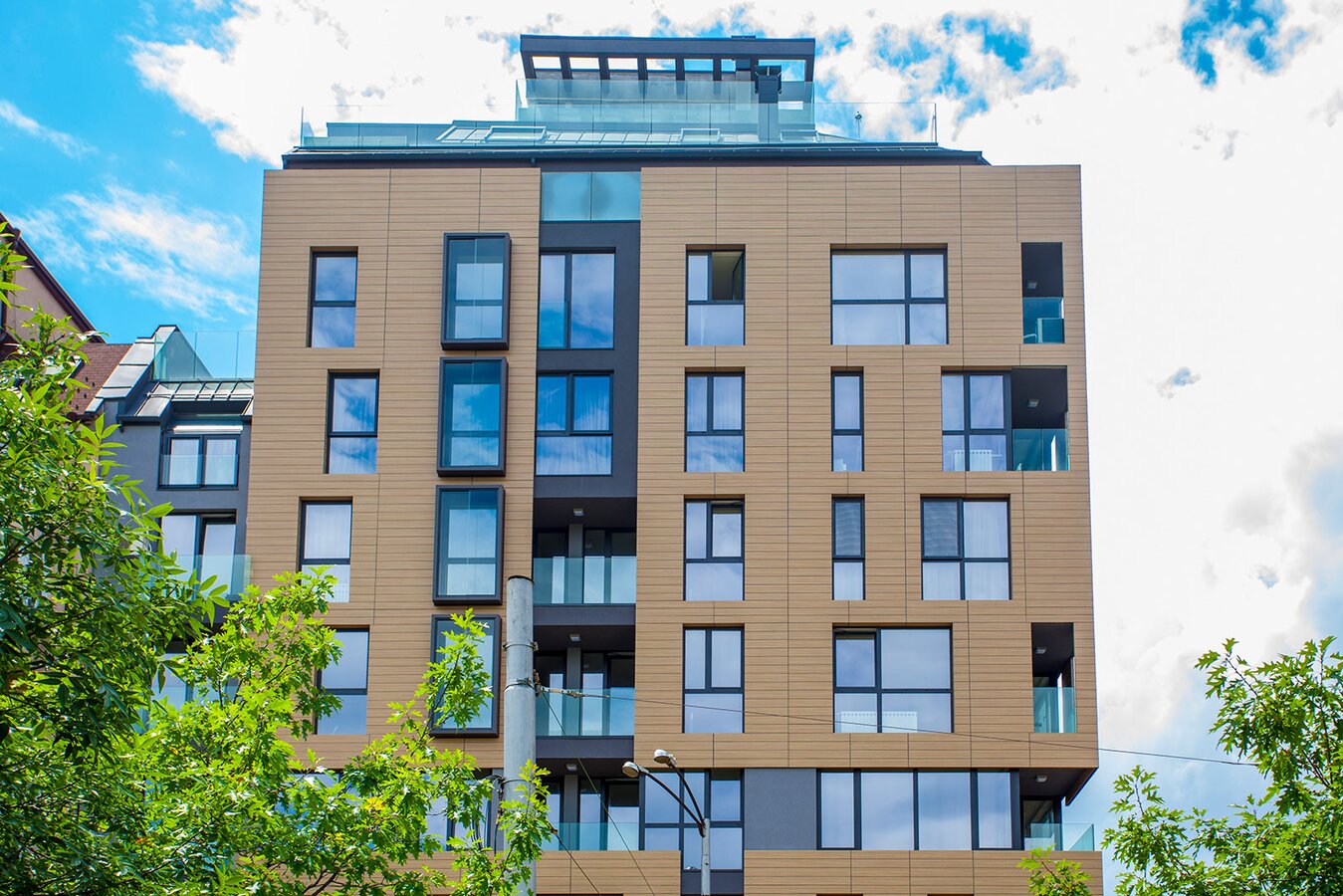 Fundermax Wohnanlage in Geshov aus Max Compact Exterior im Dekor 0923 und der Oberfläche NT